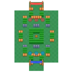 The ball starts at the center bordered by thick square bush border. There are six small bushes with their tops and bottoms covered by walls. A horizontal wall is placed near to the border and further from it is a longer wall barricade, which behind it contains two even smaller bush clusters. Goals contain two large entrances with the opening only being three tiles long. The map is horizontally and vertically symmetrical.
