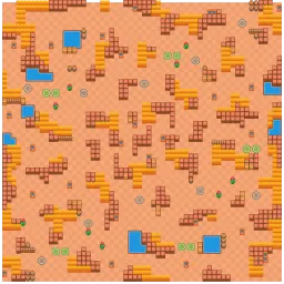 The map gets progressively more open the further Brawlers are from the center. 27 Power Cube boxes are evenly distributed across the maps with four of them found in pairs. Center paths are narrow, but have large openings that can act as exits to more open parts of the map.