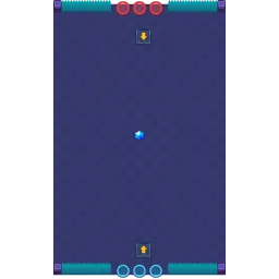 This map is completely open, with no obstacles to hide behind. There are lone walls in each corner of the map accompanied by a narrow strip of bushes right next to them. In front of the spawns are launch pads on each side of the map. The map is horizontally symmetrical.