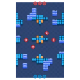 This map has a very open centre, allowing for long-ranged Brawlers to snipe the enemies. The walls in the middle lane grant cover for retreat if needed, or to better avoid incoming shots from the enemy. Ambushing is difficult due to the shortage of bushes in the map. This map is diagonally symmetrical.