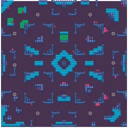 On each corner near the middle are boxed areas with a teleporter in them, with teleport Brawlers to the next boxed area diagonal to them. The middle contains a ring of bushes with a 2x2 wall cluster inside of the ring. There are also bushes on either side of the middle, with open space as well.