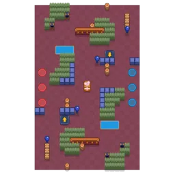 The map's center bushes are bordered by walls In the outer parts are lines of vertical and horizontal walls with some bushes curving through. Two launch pads launch Brawlers to the center bush clusters. The map is diagonally symmetrical.