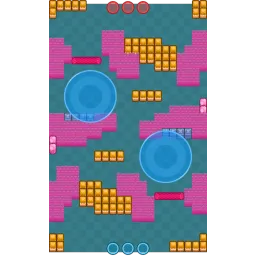 This map features a diagonally symmetrical layout with a central hot zone that both teams must control. The map includes scattered obstacles and walls that provide cover, with narrow side paths for flanking. Teams need to fight for control of the center while using cover and side routes strategically. Long-range Brawlers can excel here, while coordination and smart positioning are key to securing the zone.