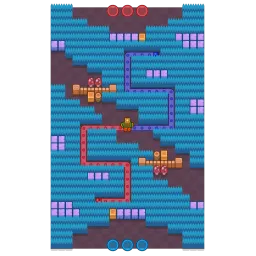 This map is mostly covered in bushes, with a few clusters of walls scattered around. A diagonal line cuts through the map with no bushes.