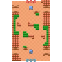 This map has a bunch of walls laid around the sidelines, making passageways narrow (lanes wise). The middle has little to no bushes, and is fairly narrow as well. The map is diagonally symmetrical.