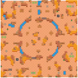 The middle is quite barren, there are 4 entrances to the ring in addition to the option of using a launch pad. There is little space outside the ring, but there are more bush clusters growing in-between walls. The map has no symmetry.