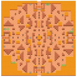 The map is geometrically patterned with an extremely large bush border on the sides. Brawlers spawn in pairs where they have the choice to retreat or defeat their "neighbor" and take the Power Cubes that spawn with them. While the map itself is asymmetrical, some areas of the map are similar to each other, such as the wall and bush clusters near the center.