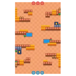This map has walls on the sides of the middle that make Trash collection difficult. However, other than those walls, there isn't much cover in the map; long-ranged Brawlers would perform well. This map is diagonally symmetrical