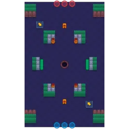 The map's center is split into a hexagon with walls facing the center and bushes bordering the opposite side, leaving an empty space between them and the gem spawn. Towards the spawns are six enclaves with bushes and two launch pads that launch Brawlers to the center. The map is diagonally symmetrical.