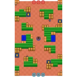 The map has a very open center and lots of bushes along the sides. It also has four launch pads, two on each side that launch Brawlers to either ends of the map or the L-like bush clusters. The map is diagonally symmetrical.