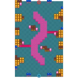 The sides are full of many blocks around the sides. Near the spawn points show 2 tree pots. On the middle shows a "serpent-like" bush at the center of the map, along with some 2x2 crates with barrels on their top and bottom. The map is diagonally symmetrical except for the group of blocks near the center.