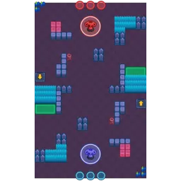 The map's sides are blocked by lakes. Near to them are bushes and launch pads that launch Brawlers behind 2x2 wall clusters. The center has an open lane, but has L-shaped walls to the side that curve inwards offering some protection. The map is diagonally symmetrical.