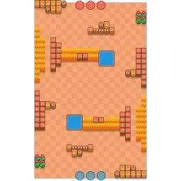 In front of each of the spawns are a small square of water, a rectangle of bushes, and two columns of walls. There is also a small amount of extra cover near spawns as well, and the middle is very open. The map is diagonally symmetrical.