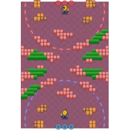 The map has several wall clusters at the sides, but has an open center. There are some bushes at the sides between the walls. The Siege IKEs have a thin barrier protecting them from frontal attacks, along with some side barriers for corner attacks. The map is diagonally symmetrical.