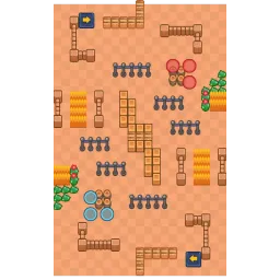 The map is split diagonally by a wall cluster. The sides have L-shaped fencing with small bush pathways in-between. Lining the center walls are rope fences facing horizontally. The map is diagonally symmetrical.