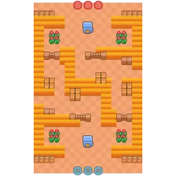 The middle of the map has a Z-like long bush pathing the two safes. The side lanes of the map have two long bushes each. Between the lanes are smaller wall clusters. The map is diagonally symmetrical.