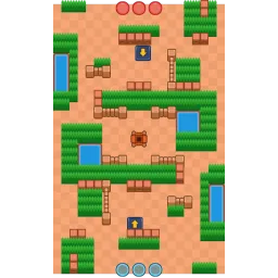 There is a launch pad on top of the spawn wall, which launches Brawlers towards the center of the map. Bushes are placed at the center bottom and top protected by fencing. These bushes curve toward square lakes. Near the lakes are 3x3 bushes also covered by walls blocking them off from the center. Towards the opposite sides of these walls are larger lakes with bushes bordering the sides. The map is diagonally symmetrical.