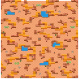 The map contains several wave-like bushes connected by walls and lakes. The center is open and contains four Power Cube boxes with the other twenty separated evenly into each quadrant. The map's gameplay relies heavily on the wave-like bushes and the walls that edge them. There is no symmetry on this map.