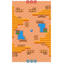 There are two large bushes on both sides and two smaller bushes near the larger bushes. Close to the center are medium sized lakes, cacti, and smaller wall clusters. The map is diagonally symmetrical.