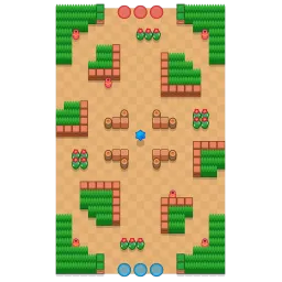 The map has bush filled corners with arrow shaped wall formations circling around the center of the map. Near to the center star are confined barrels and fencing which deter Brawlers from switching sides. The map is diagonally symmetrical, but the corner patches and the center fencings are symmetrical in all directions.