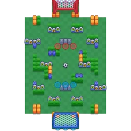 The map has an open center with diagonal bushes to the side curving inward and outward. Three tiles worth of horizontal fencing with bushes facing goals can be found near each goal. The goals have three entrances, and a three tile opening. The map is diagonally symmetrical.