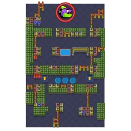 The map is split into three segments with buildings clustered near to them or rope fences. Near the center are two launch pads which launch Brawlers directly to the monster's spawn location. The map has one lake and a total of 89 buildings that the monster aims to destroy, most of which are found in clusters. There is no symmetry on this map.