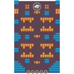 The map has table-shaped walls with 2x2 bushes placed diagonally starting from the corner. Several 3x1 wall formations prevent direct fire. Near the Big Brawler are four additional 2x2 walls acting as further cover. Right next to the Hunters are big clusters of bushes in the bottom corner and a few clumps of bushes on the left and right side of this map. The map is vertically symmetrical.