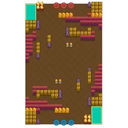 Near spawns, there is a barricade, and some bushes behind the barricade. To the right there are some water tiles partially surrounded by walls. In the center there is lots of open space with no bushes. The map is diagonally symmetrical.