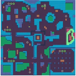 The map consists of 4 different sections. The top left consists of an open playing field. The top right and bottom left have the same corner lakes, but the bottom left section contains more lakes with narrow passageways. The bottom right contains a graveyard. The center is surrounded with spikes except for its bottom left. The map has no symmetry.