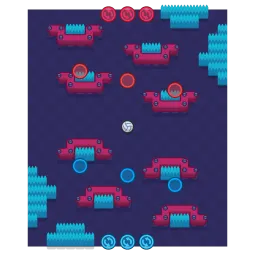 Map spawns are spread diagonally behind a series of arced fences. Some bushes are placed near the map's corners but most of the map is open.