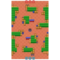 The map has bushes at the sides encased by walls. Smaller patches in the middle lane have entrances facing the center and another facing each team. The map is diagonally symmetrical.