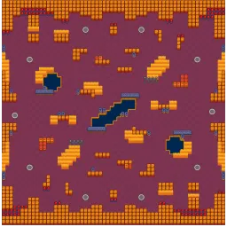 On the top left and bottom right corners around the middle have circular lakes with walls and bushes on the inside of them. The top right and bottom left corners have lots of bushes and open areas with rope fences on one side of the bushes. The middle contains a river with obstacles placed on each side horizontally. The top and bottom parts of the map have small clusters of walls.