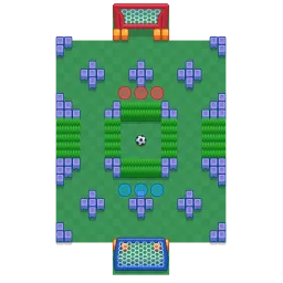 This map has many walls obstructing movement, making diagonal movements more easier than horizontal or vertical movements. The three plus-sign shaped walls prevent enemies from approaching or scoring easily, acting as a replacement to the conventional string of walls in front of the goal to defend the goal. The walls around the side of the goalpost provide additional defence. This map is horizontally, vertically, and diagonally symmetrical.