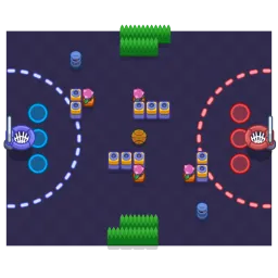 The map has two small clusters of bushes on the top and bottom. There are 4 clusters of barriers that form an L shape and a block near each of the smaller L shaped barriers. This map is diagonally symmetrical.