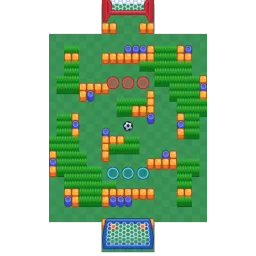 The map is filled with bushes within the "Turtle Shell". Near the goals, there is a wall that blocks the goal. There are many walls along the goal, and inside as well. The pathways are narrow while trying to get the Ball. The map is diagonally symmetrical.