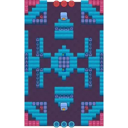 It is a mirror image of its self. The centre of the map is shaped into a rhombus with tight lanes on the outskirts. The side lanes lead to four diagonal corner lanes of bushes that connect to the spawning locations. The centre contains a rhombus like wall with bushes in the periphery, while the centre left has access to the left lane and the centre right has access to the right lane. The safes are protected by walls aside from the diagonal lanes and two entrances. Twisted Gems is horizontally and vertically symmetrical.