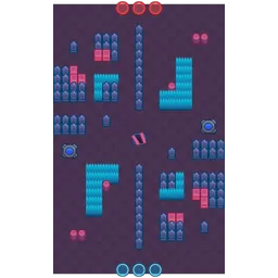 Each side of the map is divided by a long, narrow wall. On the right side of the map are three large clumps of walls with the smallest having a narrow bush row on it. The left side consists of a large bush cluster and a teleporter to the top left of it. The map is diagonally symmetrical.