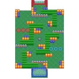 Brawlers spawn near to a zig-zagging bush cluster. Small wall clusters are scattered across the map with a horizontal fence barrier blocking the goal entrances. This map is diagonally symmetrical.