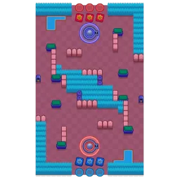The map has many walls and bushes in the center, giving rise to Brawlers that perform well close range, for they could ambush the enemies whose escape path is blocked by the walls. The walls can also be used to bounce off the cards to score: particularly those next to the discard pile. This fact is useful when the direct path has been blocked by the enemies. This map is diagonally symmetrical.