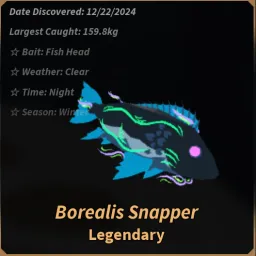 LegendaryThe Borealis Snapper is a Legendary fish, obtainable at the Glacial Grotto.