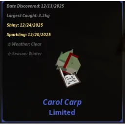LimitedCarol Carp is a Limited fish found in the Glacial Ridge during the Fischmas (2025) event.