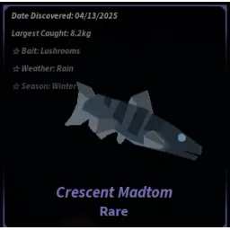 RareThe Crescent Madtom is a Rare fish that can be caught during a Blue Moon Event in the Second Sea. Due to its low rarity, it makes it an easy catch, moving slowly across the fishing bar while inflicting a +20% progress speed while reeling it in.
