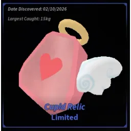 LimitedThe Cupid Relic is a Limited item that can be obtained from fishing anywhere During Valentides 2026. The Cupid Relic has a 0.00025% (1/4000) chance of being lured in the Ocean, with an increased chance of catching it when fishing in Sweetheart Shores as of update 1.70.0. The chances are also affected by luck stats. When used, it will give the Cupid Enchant, A Primary One.