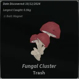 TrashThe Fungal Cluster is a Trash mushroom obtainable at Mushgrove Swamp. Due to its low rarity, it makes for an easy catch, moving slowly across the fishing bar. It is easier to obtain Fungal Clusters using Crab Cages than with the Magnet bait.