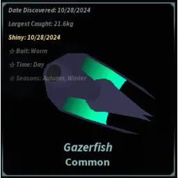 CommonThe Gazerfish is a Common fish obtainable around Desolate Deep and Brine Pool. Due to its low rarity and weight, it makes for an easy catch, moving slow and steady across the fishing bar.