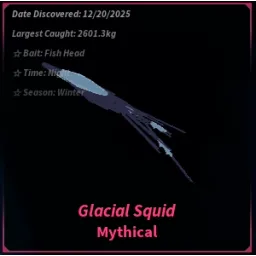 MythicalThe Glacial Squid is a Mythical fish obtainable in the Crystal Fissure at Boreal Pines. Due to it's high rarity, it makes for an Challenging catch, moving erratically across the fishing bar across the fishing bar. When reeling it in, a -85% progress speed is applied.