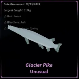 UnusualThe Glacier Pike is an Unusual fish obtainable in the Snowcap Pond, at Snowcap Island. Due to its low rarity, it makes for an easy catch, moving slow and steady across the fishing bar.