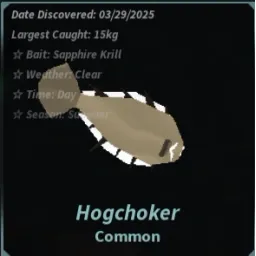 ExtinctThe Hogchoker is a Extinct fish found in the Open Ocean. It makes for an easy catch, moving slow and steady across the fishing bar.