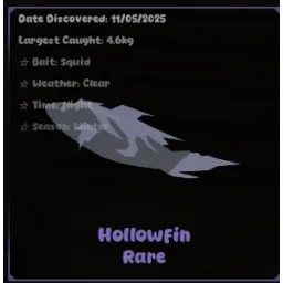 RareThe Hollowfin is a Rare fish that is able to be caught in Cursed Isle. Despite its rarity, it is a challenging catch, moving erratically across the fishing bar while inflicting a -67% progress speed.