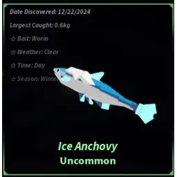 UncommonThe Ice Anchovy is an Uncommon fish found in the Overgrowth Caves. Due to it's low rarity, it makes for an easy catch, moving slowly across the fishing bar.